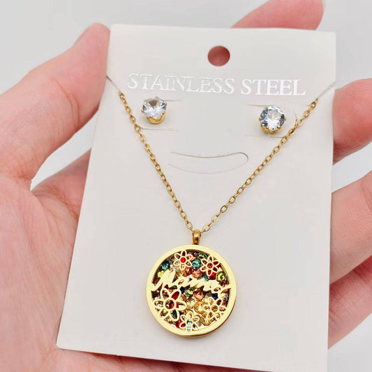 Mama 18K Gold Plated Stainless Steel Necklace and Ear Studs
